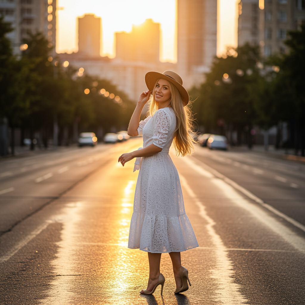 A stunning woman in an elegant white dress and a stylish hat stands gracefully on a glistening street, her long blonde hair catching the golden hour's warm glow. Her loving smile radiates warmth as the city's skyline forms a beautiful backdrop. She embodies grace in a delicately detailed portrait reminiscent of an Ivan Shishkin masterpiece, captured in the vivid clarity of a Sony a7III, enhanced in 16k UHD with HDR refinement. The scene's ethereal essence evokes a surreal, dreamlike quality, blending realism with artistic imagination.