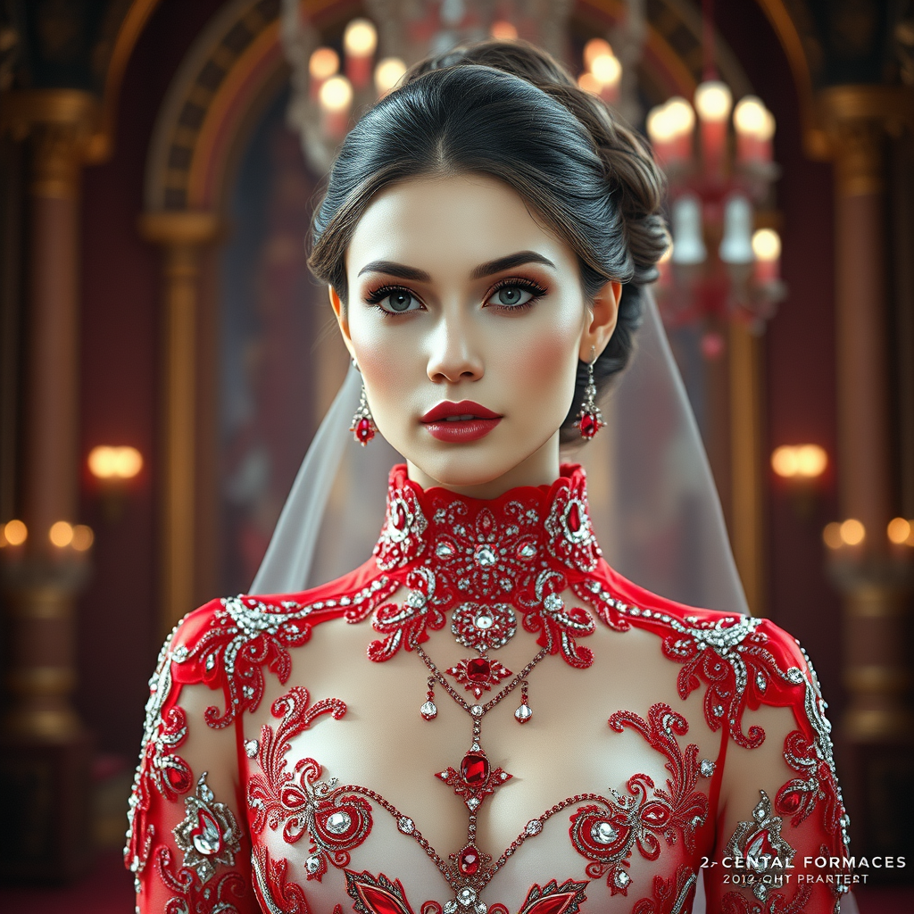 A stunning woman in an exquisite red dress crafted from rubies and shimmering diamonds, featuring intricate detailing. The gown blends fashion-forward design with soft silk and textured brocade elements. Set in a Sci-fi Victorian great hall, the scene embodies a luxurious fashion show. The woman’s elegant turtleneck bridal gown portrays beauty and grace, reminiscent of a wedding photoshoot. Her face radiates beauty with ultra-realistic, cinematic lighting. Inspired by Peter Mohrbacher, the full-body shot captures a symmetrical masterpiece in octane render quality, available in both 8k and 4k resolution.