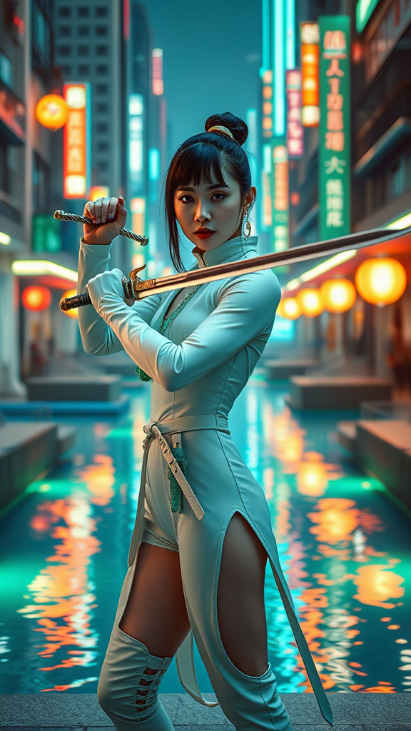 A stunning woman in avant-garde futuristic attire brandishes a sleek sword, captured in a cinematic movie still with lifelike clarity. Her ensemble blends shades of light green and white. The aesthetic echoes the vibrancy of Fujifilm Eterna Vivid 500T film. Set in a Chinapunk-inspired cyberpunk world, she stands amidst an urban landscape featuring a network of neon-lit pools, enhancing the sense of cybernetic realism and aquatic ambiance.