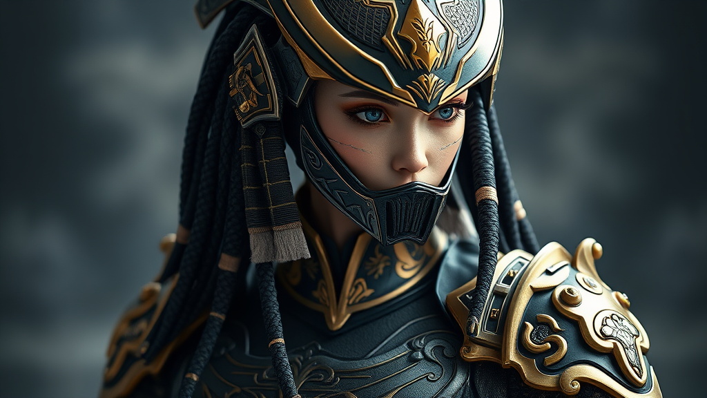 A stunning woman in Predator-inspired cosplay, exquisitely detailed, merging the elegance of Ming Dynasty artistry with the cutting-edge realism of Unreal Engine 5. Her costume, a striking palette of dark gray and lustrous gold, boasts an anime aesthetic with intricate designs that reveal new surprises at every glance. The stylish ensemble combines traditional elements with futuristic flair, creating a captivating visual narrative that embodies the harmonious blend of ancient and modern.