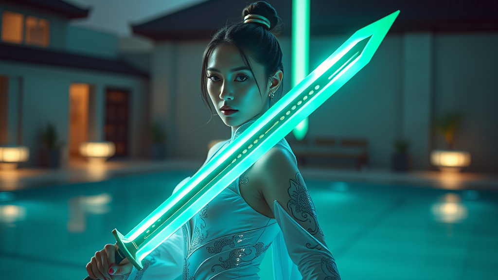 A stunning woman in sleek, futuristic attire holding a gleaming sword, reminiscent of a film still, captured with snapshot realism. The scene is infused with hues of light green and white, evoking the vivid tones of Fujifilm Eterna 500T. Set in a chinapunk-inspired, cyberpunk realistic world, she stands confidently by a shimmering pool, reflecting the stylized poolcore aesthetic. Her presence embodies the fusion of traditional and high-tech, with intricate patterns woven into her attire, underlining the advanced yet culturally rich environment.