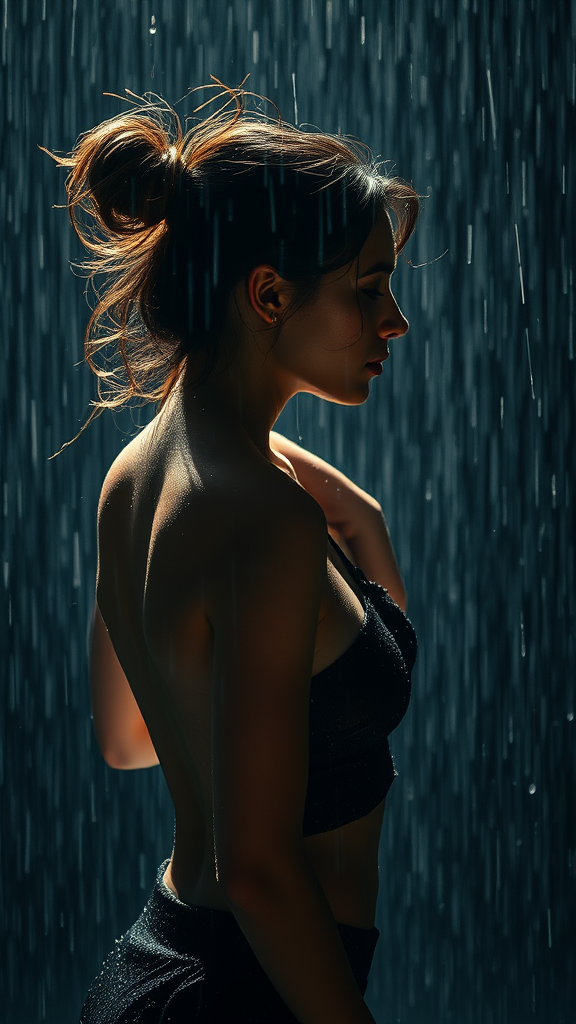 A stunning woman moves gracefully under the pouring rain, her silhouette illuminated by streaks of light as droplets cascade down her skin. Her wet face glows with an ethereal beauty, while her hair is elegantly tousled in a loose, messy bun. Each raindrop adds a sense of vivid detail to her form as she dances, creating an atmosphere of raw elegance and natural allure in an ultra-high definition setting.