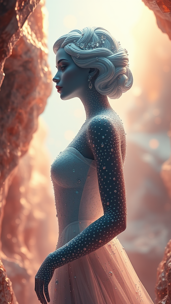 A stunning woman sculpted from diamond and silk, adorned with shimmering gems and tiny sparkling dots, stands gracefully amidst the ethereal ambiance of a crystal cave. Her presence radiates in the style of Darek Zabrocki, encapsulating the essence of magic realism with a stunning blend of gradient colors and cinematic lighting. The scene is bathed in a soft bokeh effect, capturing every intricate detail in Ultra-detailed Quality 3D. This masterpiece is realized through the power of 3D render octane and the Unreal engine, offering a dynamic VFX experience. Positioned in an isometric perspective and crafted meticulously in Blender, the scene is rendered in breathtaking 8k, creating an ultrahd cinematic vision that is perfect for a captivating wallpaper backdrop.
