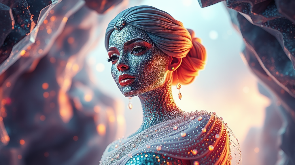 A stunning woman sculpted from glittering diamonds and shimmering silk, adorned with radiant gems and sparkling dots, set against the mesmerizing backdrop of a crystal cave. In the style of Darek Zabrocki, infused with magic realism, the scene is bathed in gradient hues and cinematic lighting. The environment is enhanced with a soft bokeh effect, showcasing ultra-detailed quality in 3D. Rendered in Octane and Unreal Engine, with VFX elements, presented in an isometric view as if crafted in Blender. Boasting 8k resolution, the scene unfolds like a cinematic Ultra HD wallpaper, capturing the ethereal beauty of a fantasy realm.