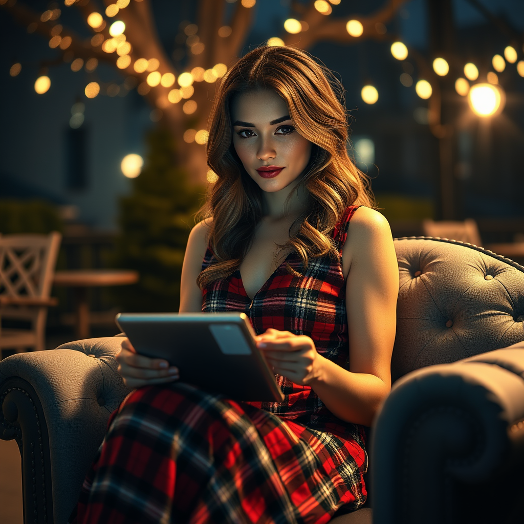 A stunning woman seated comfortably with a digital tablet in hand, dressed in an exquisite tartan dress, set against an enchanting night-time outdoor backdrop, enveloped in soft volumetric lighting, realistic and intricately detailed, captured in a photography style with gentle low contrast, evoking the essence of Kodak Portra 400 film, rendered in 8k resolution -- aspect ratio 9:16 -- stylization at 750.