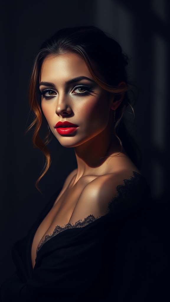A stunning woman standing amidst a play of deep shadows, her features highly defined with intricate details and a sense of hyper-realism, as if captured in an ultra-high-resolution 32k photograph, the scene enriched with subtle creative elements that enhance her elegance and allure, surrounded by an atmosphere of mystery and sophistication, her expression enigmatic, drawing viewers into a world of vibrant contrasts and captivating beauty.