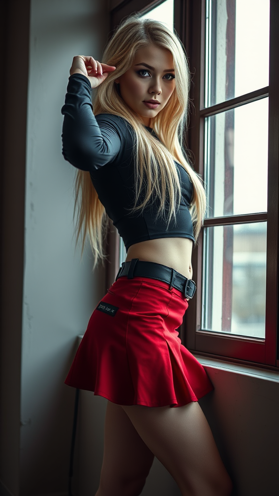 A stunning woman standing beside a window, striking a pose in edgy black long sleeves and a bold micro miniskirt, embodying the punk rock aesthetic with a splash of red. Her long blonde hair cascades down, exuding a rebellious schoolgirl vibe. The photography captures her essence in high detail, set against a backdrop that complements her daring style, creating a vivid and captivating image.