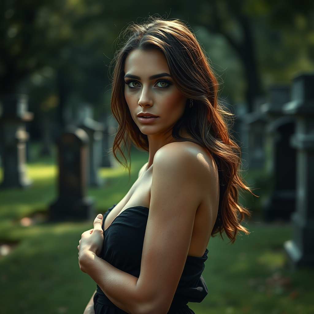A stunning woman stands gracefully in a cemetery, exuding charm and confidence. Her gaze meets the viewer's, suggesting an intriguing connection. The portrait captures her with a focus on intricate skin details, presenting a hyper-realistic and cinematic quality. The scene uses diffused soft lighting and a shallow depth of field to accentuate her figure in full-length, 8k definition. Emphasizing realistic, vibrant colors and high detail, the image reflects a sense of elegance and allure. The composition maintains artistic integrity free from technical flaws or distortions, ensuring a refined and captivating visual representation.