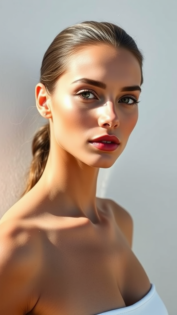 A stunning woman stands poised before a minimalist white wall, her strong presence reminiscent of Vanessa Beecroft's art. Her hair, a slick low ponytail, accentuates her beautifully sculpted face and flawless, glowing skin. The sun's rays dance across her features, creating a captivating interplay of light and shadow. Her expression is serene yet captivating, capturing a hyperrealism that evokes a modern Tumblr aesthetic. Her features bring to mind the allure of Sophie Mudd, set in a portrait with an elongated 3:4 aspect ratio, encapsulating elegance and contemporary grace.