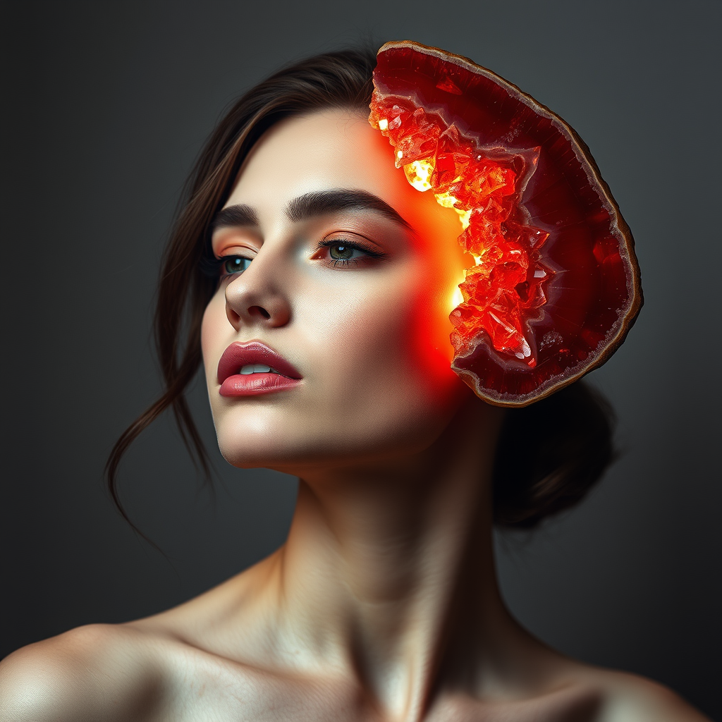 A stunning woman, three-quarter head to shoulders portrait, composed of a luminous red crystal geode, artistically split to reveal an intricate interior of vibrant crystals. Her skin resembles smooth marble with subtle veins, adding an ethereal elegance. The surreal concept captures the interplay of light and texture, blending raw beauty with a dreamlike quality.