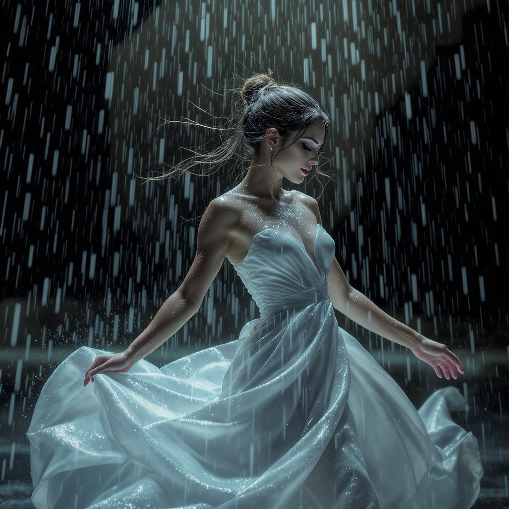 A stunning woman twirls gracefully in the pouring rain, her elegant, wet features glistening under the downpour, with a loosely tied messy bun dripping with water, captured in 32k UHD with exquisite detail. Her dress clings to her form, accentuating her graceful movements as droplets bounce off her skin, lending a sense of vibrant energy to the scene. The atmosphere is alive with motion, as rain cascades around her, creating a mesmerizing dance of water and light.