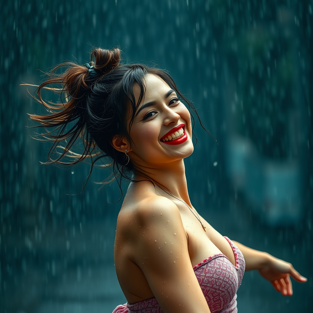 A stunning woman twirls joyfully in the pouring rain, her face and body glistening with droplets, hair styled in a charmingly disheveled bun, captured in breathtaking 32k UHD clarity, revealing intricate details and a vibrant energy.