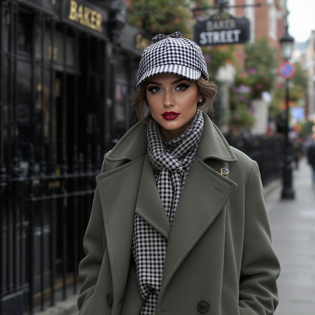 A stunning woman wearing a classic Sherlock Holmes ensemble stands confidently on Baker Street in London, exuding an alluring charm as she gazes directly at the viewer. This portrait exudes photographic realism with detailed skin and an 8k resolution quality, capturing every intricate detail. Her look is enhanced by cinematic and diffused soft lighting, creating a hyper-realistic atmosphere with sharp focus and shallow depth of field. Her captivating presence and the sophisticated CGI effects make her appear almost lifelike, while the image maintains a clean, professional finish, free from any imperfections or artifacts.