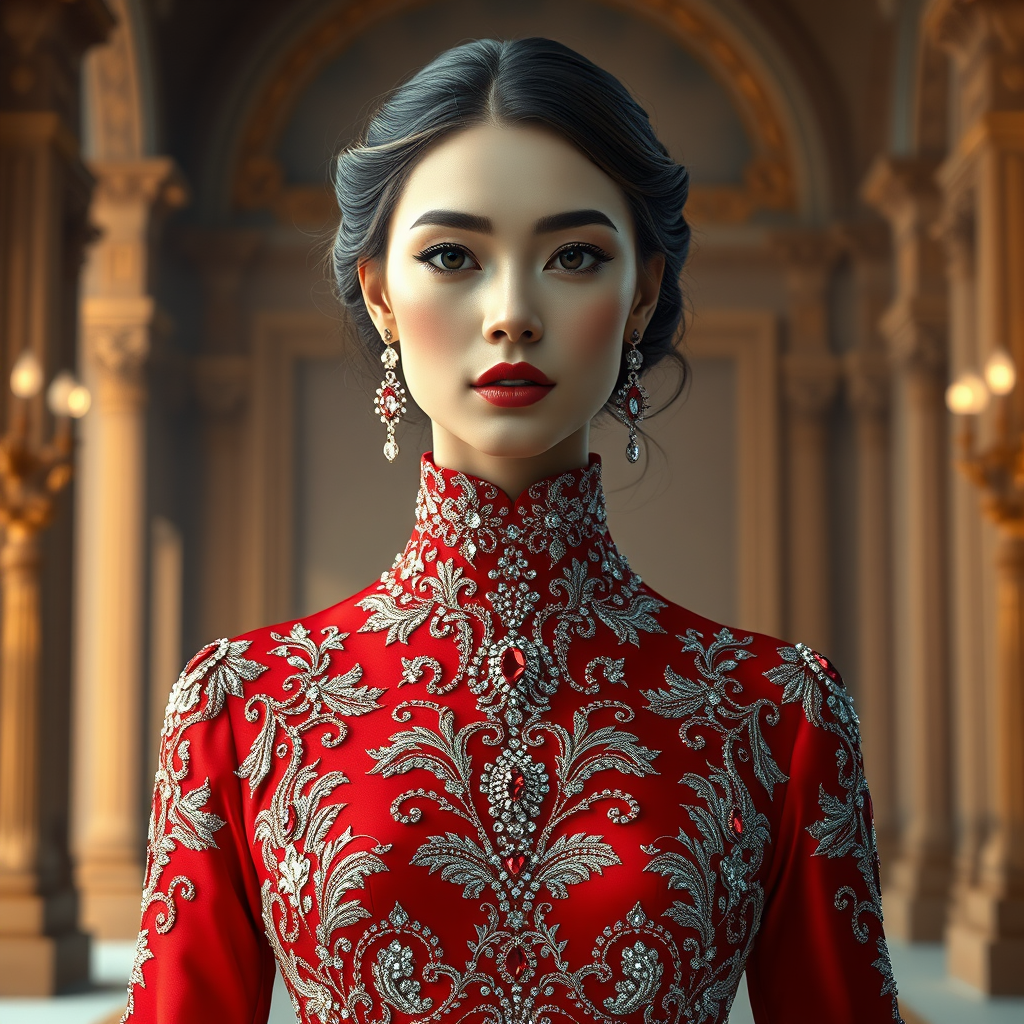 A stunning woman wearing an exquisite red dress adorned with glittering rubies and shimmering diamonds, featuring intricate designs. The dress is crafted from soft silk, highlighting a detailed brocade texture, perfect for a high-fashion runway. Her captivating face radiates beauty within a Sci-fi Victorian setting, standing gracefully in a grand hall. The dress boasts a sophisticated turtleneck and is designed as a bridal gown, exemplary of wedding photography elegance. The full-body attire is symmetrical, rendered with octane precision and inspired by Peter Mohrbacher’s artistry. Ultra-realistic in style, the scene is enhanced with cinematic lighting, captured in breathtaking 8k, 4k quality, maintaining focus away from hands and fingers.