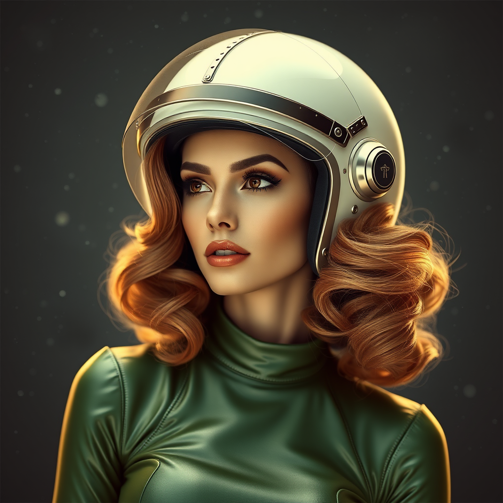 A stunning woman with a classic retro space helmet adorned with intricate detailing, her 1960s-inspired hair styled in elegant, voluminous waves. She dons a sleek, green outfit accentuated with futuristic textures, capturing a hyper-realistic essence reminiscent of vintage sci-fi photography, set against a subtly star-studded cosmic backdrop.