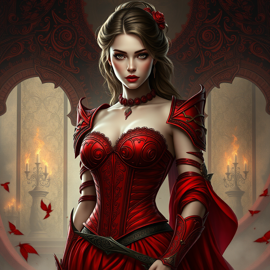 A stunning woman with a regal presence and an air of mystery, she stands adorned in an intricately designed red corset and flowing red-gown, reminiscent of Karol Bak's styled elegance. Her ensemble is enhanced with subtle red armor accents, melding fantasy and strength. Inspired by the artistry of Alena Aenami and Artgerm, the scene is filled with rich, hyperrealistic detail, capturing the essence of a gorgeous, enigmatic figure. Her gaze is piercing yet inviting, her beauty akin to Julie Bell's art, set against a backdrop of epic fantasy elements that would rival the immersive detail of Beeple's work.