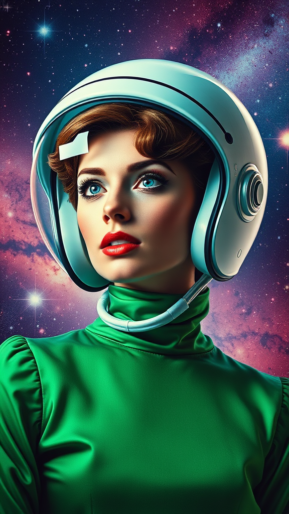 A stunning woman with a sleek retro space helmet, featuring a classic 1960s hairstyle, wearing a vibrant emerald green ensemble, captured in hyper-realistic detail against a backdrop of a vivid, star-studded cosmic landscape, accentuating the futuristic yet nostalgic aura of vintage space exploration.