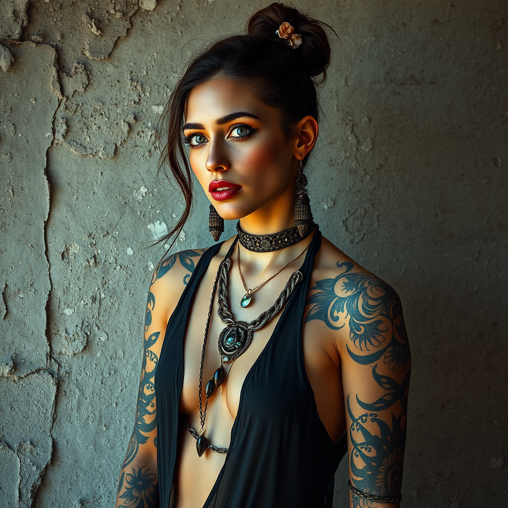 A stunning woman with a slender frame embodies a fusion of tribal and bohemian aesthetics, adorned with intricate tattoos and piercings. Her bohemian jewelry adds a modern touch, set against a textured, peeling wall background that lends an edgy urban feel. The scene is raw and gritty, featuring a sophisticated mix of colors and materials, with intricate, detailed elements reminiscent of high-fashion photography.