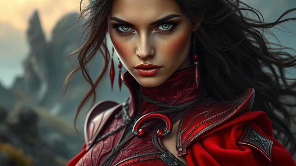 A stunning woman with an air of mystery, her eyes captivating and fierce. She dons an intricate red corset and flowing red dress that seem woven with threads of enchantment. Her attire is a fusion of elegance and strength, with crimson armor accents glinting subtly under the light. Her features are both ethereal and hyperrealistic, capturing the influence of artists like Karol Bak, Alena Aenami, and Artgerm. The background is a fantastical landscape, rendered in 8k detail, where magic and reality intertwine. This captivating figure embodies a blend of beauty and power, evoking the essence of a fantasy epic.