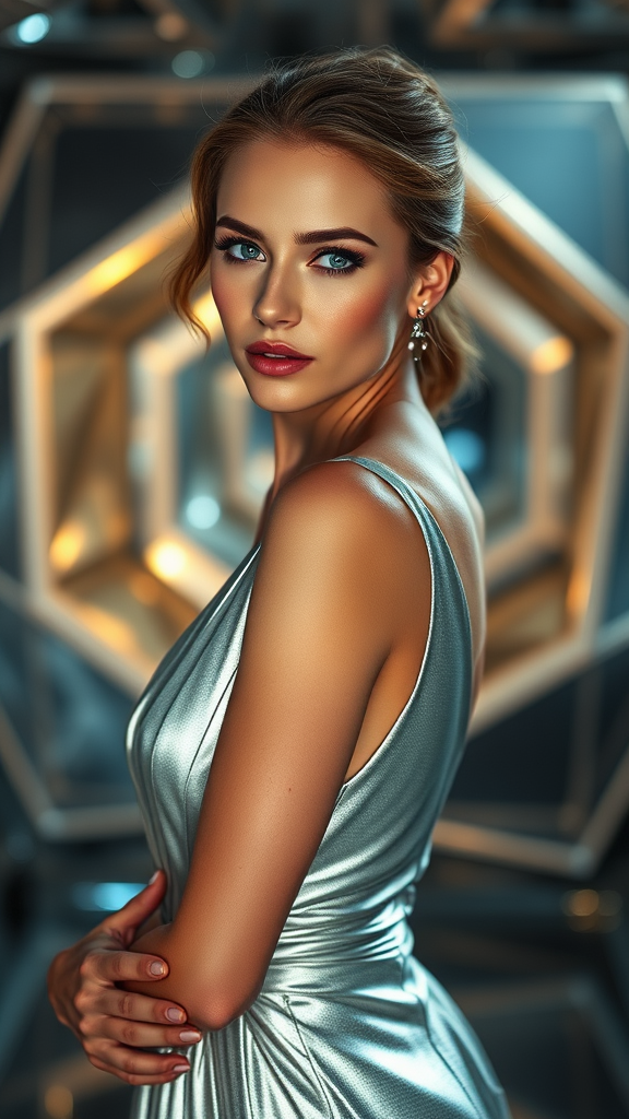 A stunning woman with bright blue eyes wearing an elegant silver dress, exuding a futuristic vibe, poses gracefully for a photograph reminiscent of a high-fashion Dior campaign. Her presence is captivating, set against the intriguing backdrop of a tesseract-like structure, blurring the lines between reality and a digital realm. The scene, influenced by the cutting-edge style trending on CG Society, channels the allure of Miranda Kerr, capturing an ethereal beauty that is both modern and timeless.
