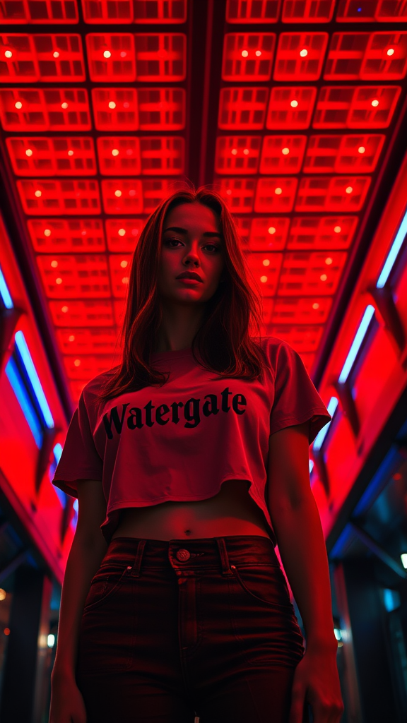 A stunning woman with captivating allure is poised confidently in a cropped Frog t-shirt, standing in front of the iconic Watergate complex. The intense red lights overhead form a structured grid pattern on the ceiling, casting a warm, cinematic glow. Along the walls and support beams, subtle blue accents create a striking contrast, heightening the moody, nightlife ambiance. Her full body is captured in the shot, exuding a sense of mystery and sophistication amidst the vibrant interplay of colors and shadows.