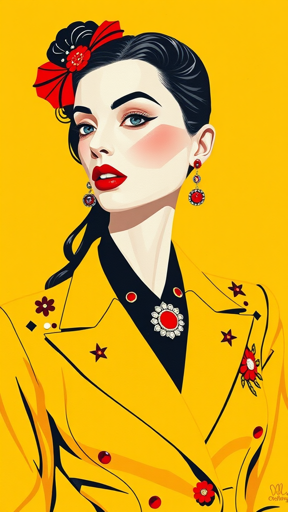 A stunning woman with delicate features and pale white skin dressed in a chic fashion suit adorned with vibrant, playful embellishments and geometric patterns. Incorporating a minimalist painting style, the background is a vivid Chelsea Yellow, with the color palette primarily consisting of Chelsea Yellow, white, black, and red. The illustration employs a flat design approach, embodying the minimalist essence of Memphis fashion illustrations. Subtle creative alterations enhance the overall presentation while maintaining the original vibe.