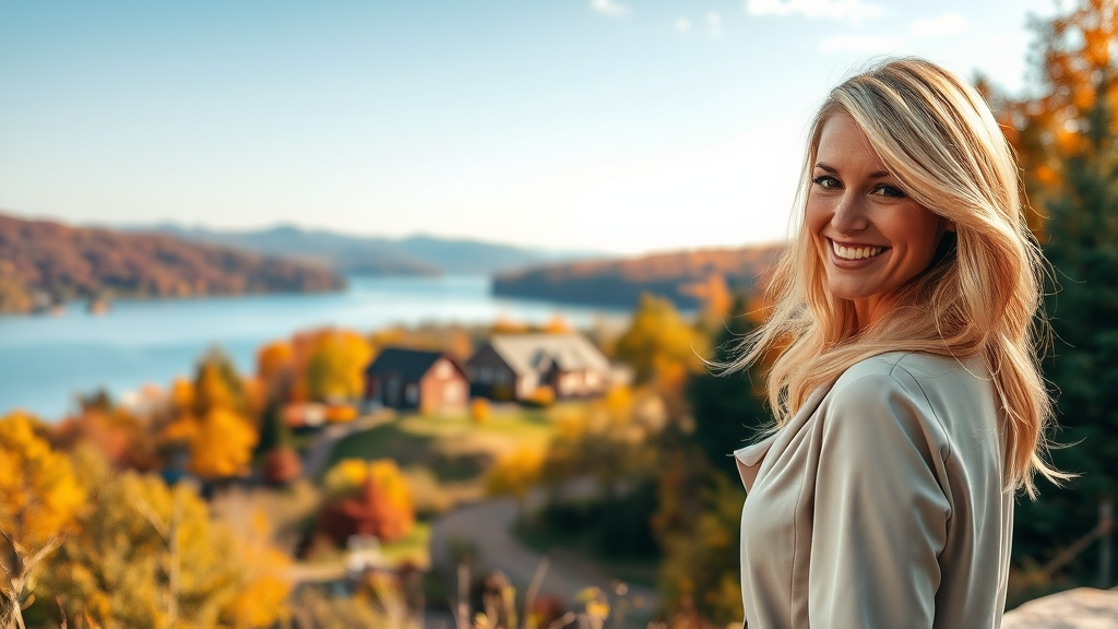A stunning woman with flowing blonde hair, viewed from the side, smiles warmly at the viewer, dressed in an elegant blouse and jacket. In the background lies a breathtaking vista of a row of charming houses along the edge of a serene lake, set against a vibrant autumn landscape bursting with color. Captured with award-winning, professional detail, the scene is rich with clarity and depth, ensuring a visually captivating image.