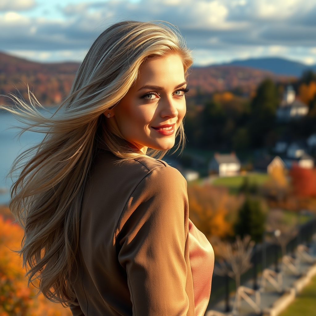 A stunning woman with flowing blonde hair, viewed from the side, gazes intently at the viewer with a captivating smile, wearing an elegant blouse and jacket. In the distance, a picturesque vista of houses lines the lakeshore, surrounded by vivid autumn hues that paint the landscape. This scene is akin to award-winning, professional photography, capturing intricate details and vibrant colors.