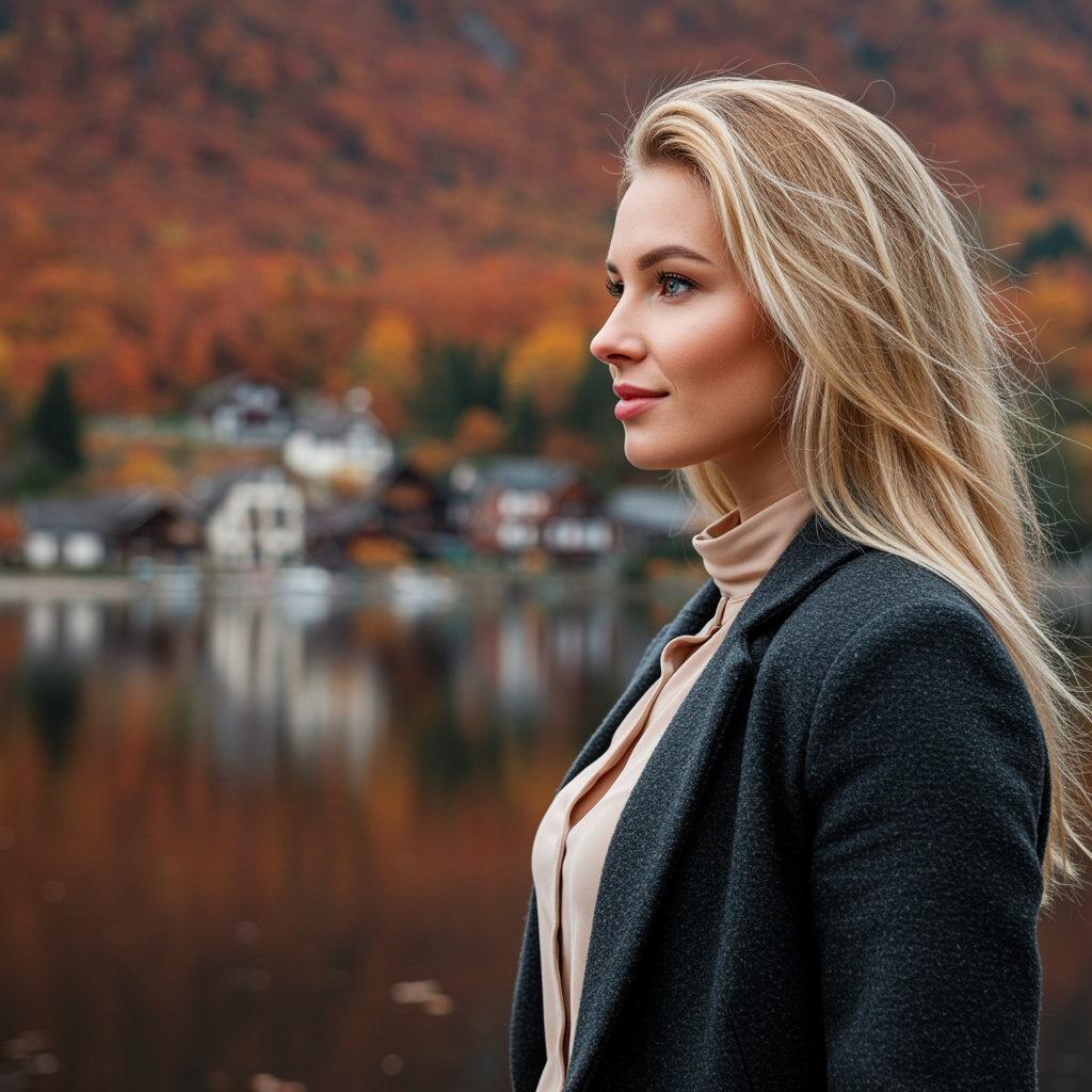 A stunning woman with flowing blonde hair, viewed from the side, gazes intently at the viewer, her radiant smile highlighting her elegant blouse and tailored jacket. In the background, a picturesque scene unfolds with a row of charming houses lining the shoreline of a tranquil lake, all set against a backdrop of vivid autumn hues that paint the landscape. Masterful, professional, and intricately detailed, ensuring clarity and vibrancy, devoid of any imperfections such as blur, distortion, or noise, with a focus on high quality and rich color.