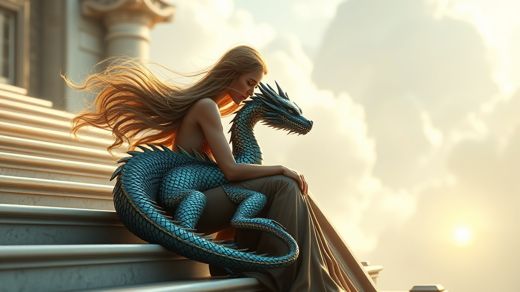 A stunning woman with flowing hair sits gracefully on a grand staircase, a small, iridescent dragon curled by her side, its scales reflecting the ambient light with mesmerizing detail, hyperrealistic, photorealistic, 8k, unreal engine, depicting an enchanting bond between them, set in an expansive, dreamlike landscape, capturing the essence of wonder and elegance.