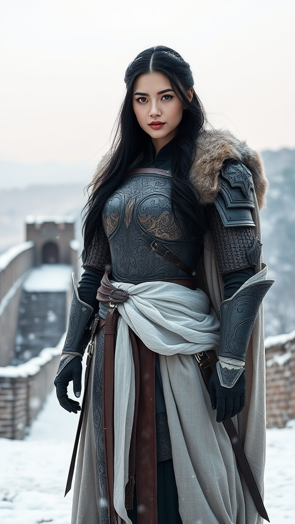 A stunning woman with long black hair stands confidently in a photorealistic scene, her presence exuding the essence of a masterpiece. She wears intricately designed armor complemented by a flowing white linen cloth and a fur-lined cape, evoking strength and elegance. The scene is set during the day, with snow gently falling around her, enhancing the serene yet formidable atmosphere. In the background, the majestic expanse of The Great Wall stretches across the landscape, framing the woman's powerful silhouette. Her striking features and the grandeur of her attire are highlighted against the wintry setting, creating a harmonious blend of beauty and might.