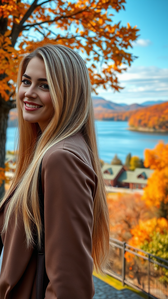 A stunning woman with long blonde hair, seen from the side, smiles warmly at the viewer, dressed in an elegant blouse and jacket. In the background, a beautiful vista unfolds with a row of houses along the shoreline of a serene lake. The landscape is adorned with vivid autumn colors, creating a picturesque scene. The image is award-winning, professional, and highly detailed, capturing the essence of natural beauty and tranquility.