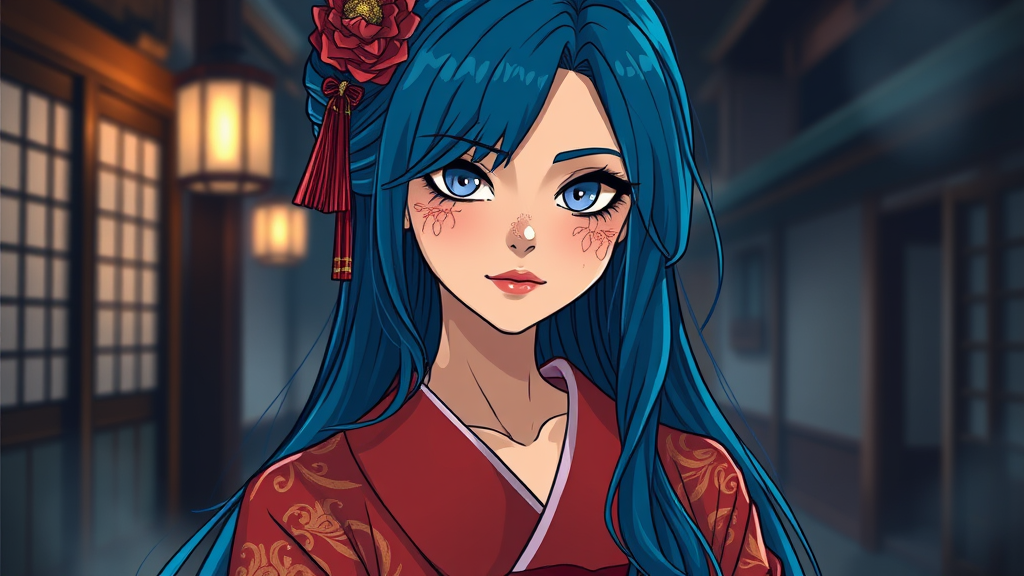 A stunning woman with long blue hair, elegantly dressed in a traditional kimono, her face delicately adorned with intricate geisha makeup that accentuates her dark, expressive eyes. She's set against a mysterious and dimly lit Japanese environment that hints at a story untold. Her face glistens with a subtle sheen of mist and earth, adding an element of raw beauty. The scene is captured in a wide view, portrayed in a vivid and stylized cartoon style, capturing both the gracefulness and the enigmatic allure of her presence.