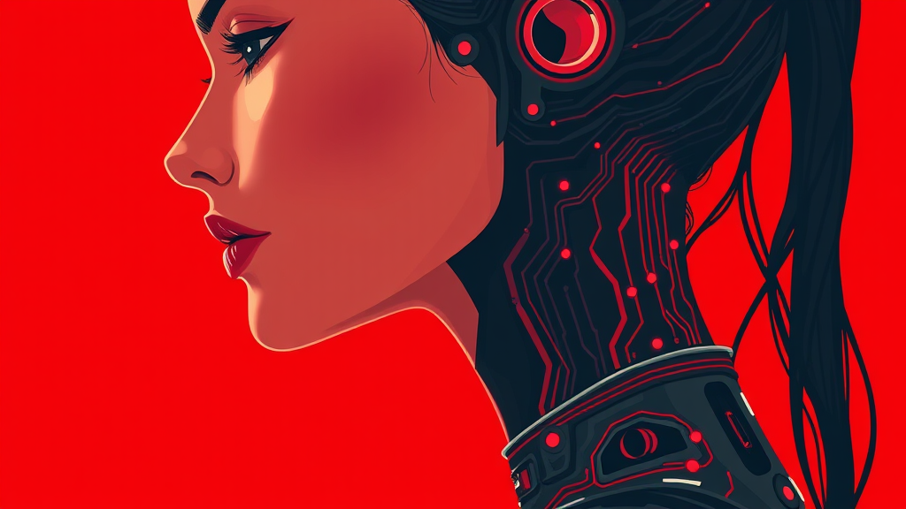 A stunning woman with sleek robotic elements, featuring intricate circuitry seamlessly integrated into her skin, depicted in a closeup of her face and neck. Her profile view highlights clean lines and minimalistic details, set against a striking red backdrop. The scene exudes a futuristic, cyberpunk vibe, captured in a 2D flat style with a palette dominated by red hues. The digital artwork echoes the elegance and storytelling of Studio Ghibli, with subtle touches of luminescence on the circuitry to add depth and intrigue.