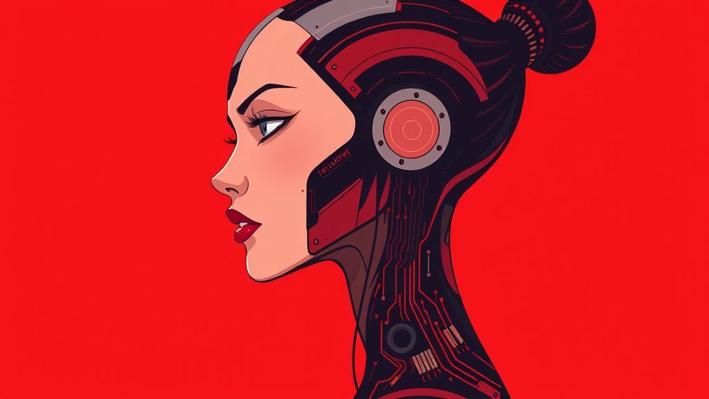 A stunning woman with sleek robotic features, her face and neck adorned with intricate circuitry, showcasing clean and minimalistic details. She is depicted in profile against a vivid red backdrop, embodying a futuristic and cyberpunk aesthetic. The design is rendered in a 2D flat composition with rich red tones, evoking the signature style of Studio Ghibli. Her expression blends humanity and technology, offering a seamless harmony between organic and mechanical elements.