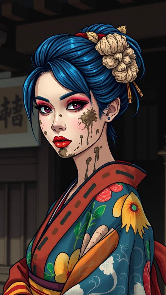A stunning woman with striking blue hair, wearing a colorful kimono and traditional geisha makeup, her dark eyes exuding mystery. Set against a shadowy, traditional Japanese backdrop, her face is artistically smeared with mud, adding an intriguing touch of nature's rawness. The scene captures a wide view, depicted in a vibrant cartoon style, emphasizing the contrast between her elegant attire and the rugged environment.