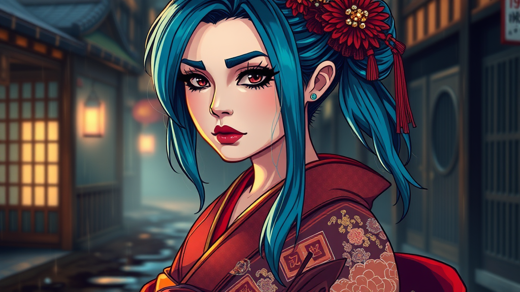 A stunning woman with vibrant azure hair, adorned in an intricately designed kimono, her face painted with exquisite geisha makeup and intense, mysterious dark eyes. She stands in a dimly lit, atmospheric Japanese setting, with a fine sheen of wet mud accentuating her serene expression. The scene captures a broad perspective, immersing the viewer in this enchanting world, rendered in a striking cartoon style with an emphasis on intricate details and rich textures.