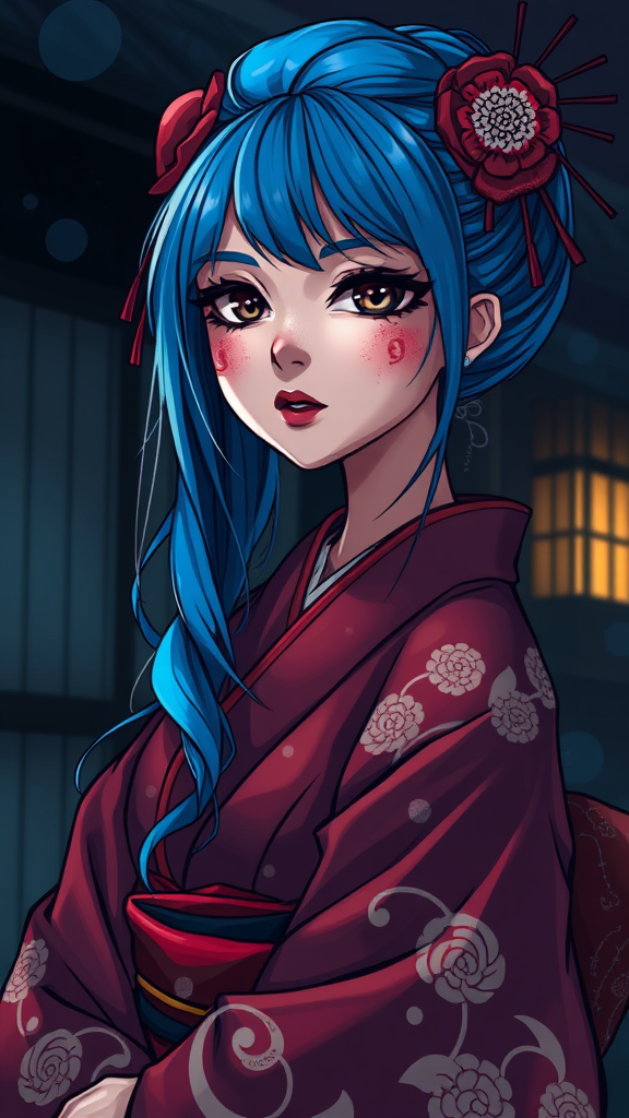 A stunning woman with vibrant blue hair adorned in a traditional kimono and geisha makeup, characterized by her striking dark eyes. She stands gracefully within a shadowy, atmospheric Japanese setting. Her face, shimmering and slick with a hint of mud, adds an intriguing texture. The wide view captures the essence of her mysterious allure in a captivating cartoon style, infusing a sense of elegance and enigma into the scene.