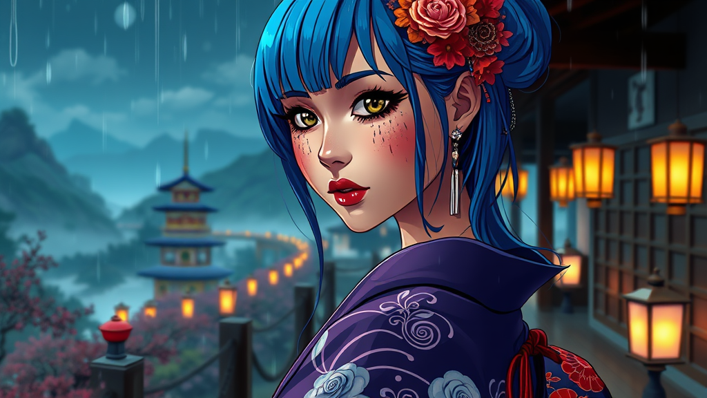 A stunning woman with vibrant blue hair dressed in an exquisite kimono, her face adorned with intricate geisha makeup highlighting her dark, expressive eyes. She stands in a serene, mystical Japanese setting, her face glistening with a mixture of rain and mud. The scenery encapsulates the beauty of traditional oriental landscapes, illuminated by the soft glow of lanterns. The view is expansive, capturing the elegance of the scene in a captivating cartoon style, creating an enchanting atmosphere.