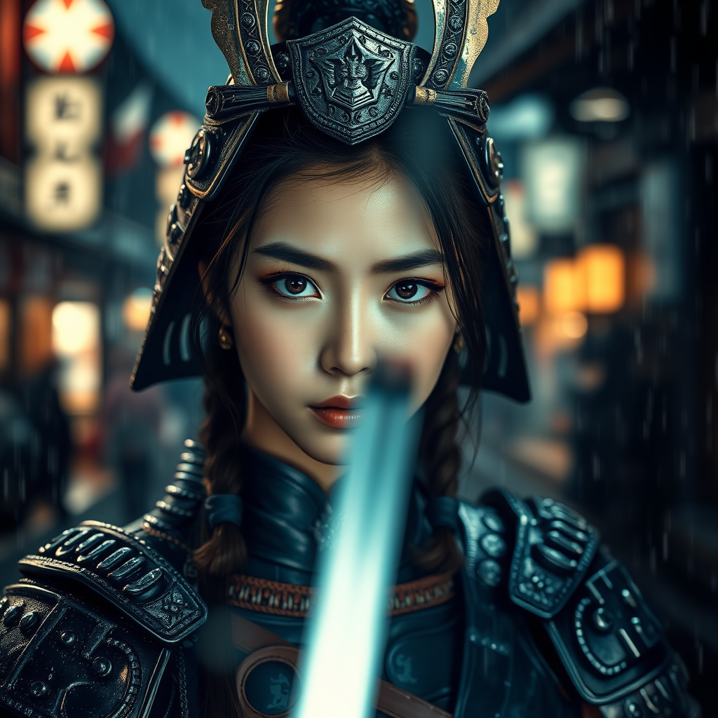 A stunning young Asian girl samurai from the 12th century, donned in intricately designed samurai armor, her beauty amplified by cinematic lighting in a dark, rain-soaked cityscape. The scene is brought to life with deep depth of field, capturing lumen reflections dancing across the wet surfaces. Her expressive face is framed in a wide-angle, hyperrealistic style, surrounded by an insanely detailed environment that immerses the viewer in a world of breathtaking authenticity.