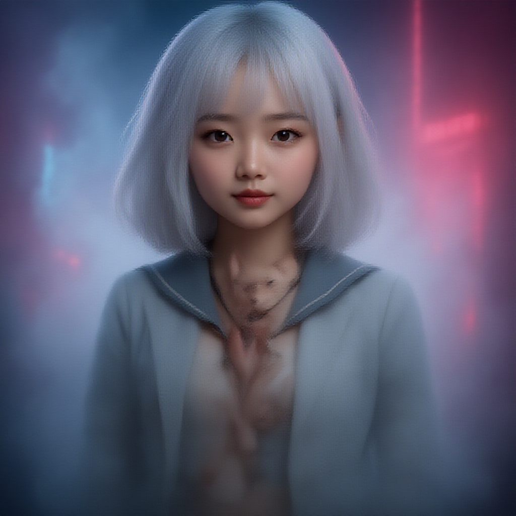 A stunning young Asian girl with mesmerizing eyes and flawless olive skin, her medium-length white hair perfectly framing her petite, toned body. She is dressed in a schoolgirl uniform, revealing a hint of her midriff, showcasing her small, athletic build. Her face is perfectly symmetrical, captivating in its beauty. The scene is set against a backdrop of neon lights and swirling smoke, enhanced by volumetric fog that adds depth and mystery. The hyperrealistic, cinematic lighting highlights every intricate detail, creating a breathtaking visual experience in 8k UHD resolution.