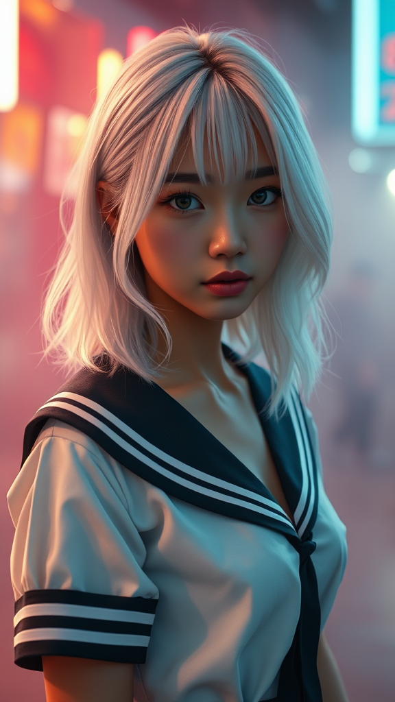 A stunning young Asian girl with striking white hair and captivating eyes, her olive skin glowing under the soft light. Her medium-length hair falls in sleek waves, perfectly framing her delicate features. She has a petite, toned body with small, graceful curves, and her school girl uniform stylishly reveals her midriff. The setting is enveloped in a neon light haze, enhanced by volumetric fog that creates a hyper-realistic and cinematic atmosphere. The scene boasts breathtaking 8k UHD quality, focusing on intricate details. Despite a few artistic quirks like slightly surreal anatomy, her face and hands retain an enchanting allure. The overall impression is dreamlike and otherworldly, with a mysterious, ethereal vibe.