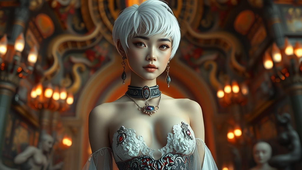 A stunning young Asian queen with striking short white hair and a beautifully detailed face stands against a fantasy background. Her toned stomach and midriff are elegantly displayed, complementing her ethereal presence as the queen of the dead. Her features embody hyperrealism, captured with cinematic lighting that enhances every intricate detail. The environment is breathtaking, rendered in a wide-angle perspective that immerses the viewer in the scene. The artistry, reminiscent of Greg Rutkowski and Magali Villeneuve, combines CGI elements for a doll-like, 3D effect using octane rendering. The portrayal avoids imperfections, focusing instead on the crafted beauty and mystique of this captivating figure in her fantastical realm.