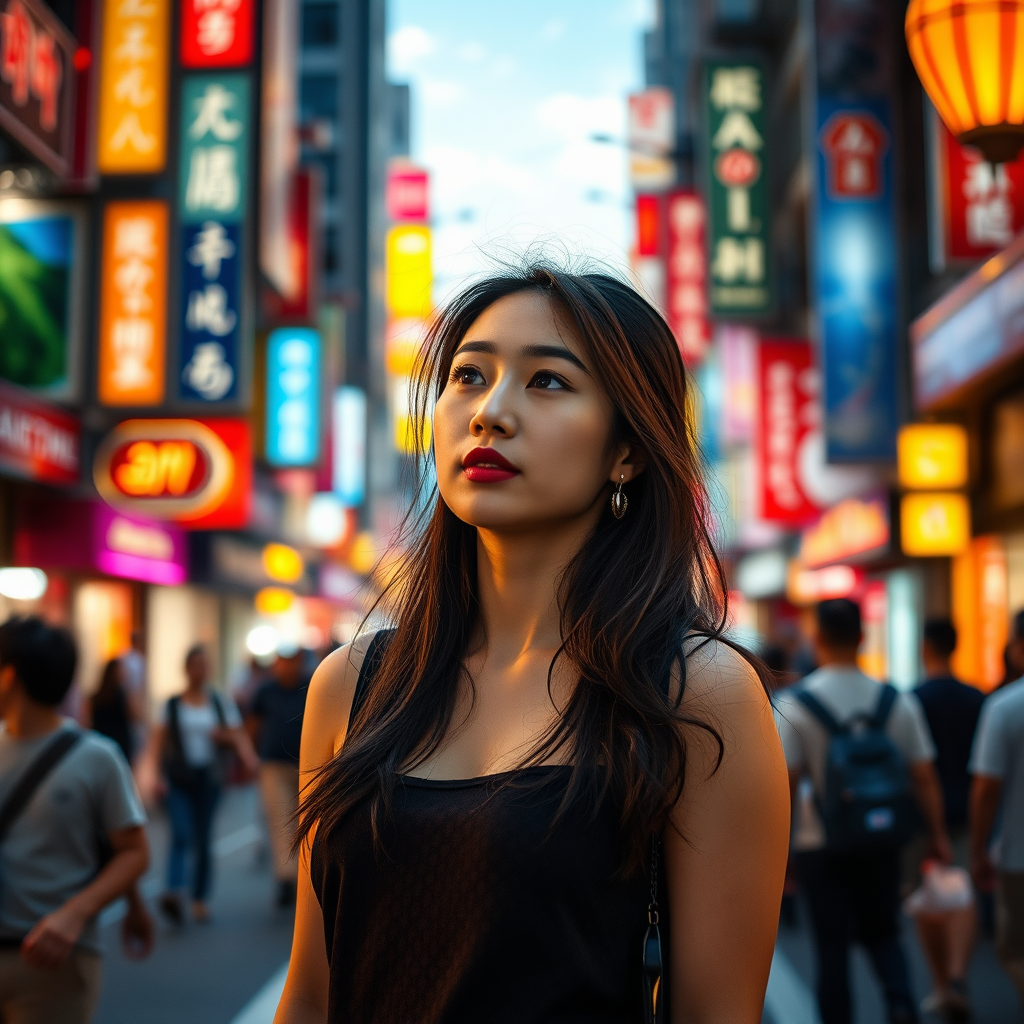 A stunning young Asian woman stands amidst a bustling city street, captivated by her surroundings on a lively late afternoon. Captured with a Sony A9 mark II using a 50mm prime lens on revolog 600 nm film, the image is vibrant with a dynamic interplay of sunlight and urban lights, creating a rich and colorful backdrop. The scene exudes cinematic realism, accentuating her natural beauty as she absorbs the vibrant energy of the city. The lighting highlights the diversity of the urban landscape, enhancing the depth and allure of the moment. The setting is alive with motion and color, framing her as a serene observer within the pulsing throng. Her expression reflects wonder and curiosity, perfectly complemented by the harmonious blend of natural and artificial light that bathes the scene. The focus is clear and detailed, capturing the essence of an urban atmosphere that is both lively and serene, without any exaggeration or distortion.