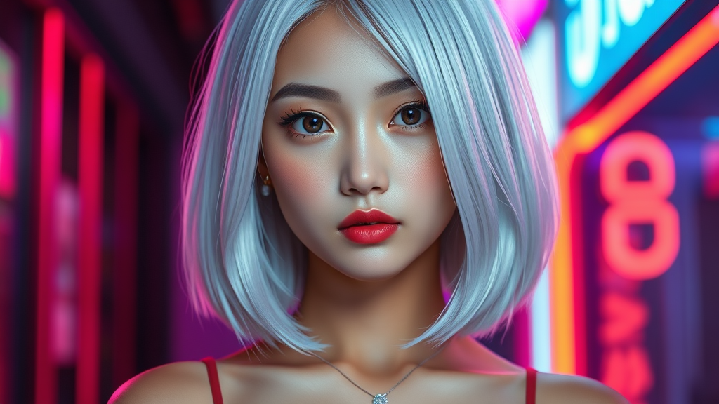 A stunning young Asian woman with captivating eyes and smooth olive skin is highlighted by her medium-length, silky white hair. Her petite, toned physique elegantly showcases her midriff, complemented by a delicate touch of jewelry. Set against a vibrant neon-lit background, the image is captured with cinematic lighting, presenting a breathtaking, photorealistic quality in 8k UHD. The perfect symmetry of her eyes and the exquisite detail in her expression draw the viewer in, akin to a masterpiece of digital art. Rendered with hyperrealism, this creation blends the allure of photography with elements of CGI and anime illustration, ensuring a mesmerizing visual experience that maintains its beauty while avoiding any imperfections or distortions.