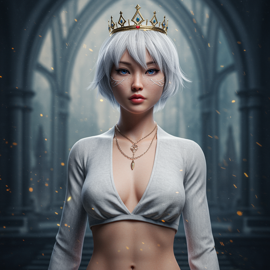 A stunning young Asian woman with short white hair and a detailed, gorgeous face stands as the queen of the ethereal realm. Her midriff is elegantly revealed, showcasing a toned stomach and small bust, embodying grace and power. Set against a fantasy backdrop, the scene is captured in hyper-realistic detail with cinematic lighting, evoking a breathtaking atmosphere. The environment is depicted with wide-angle precision, inspired by the artistry of Greg Rutkowski and Magali Villeneuve. The imagery is a blend of CGI and 3D render techniques, producing a doll-like, lifelike effect. Despite her regal presence, there is a surreal touch to her form, creating a slightly unreal, otherworldly appearance.