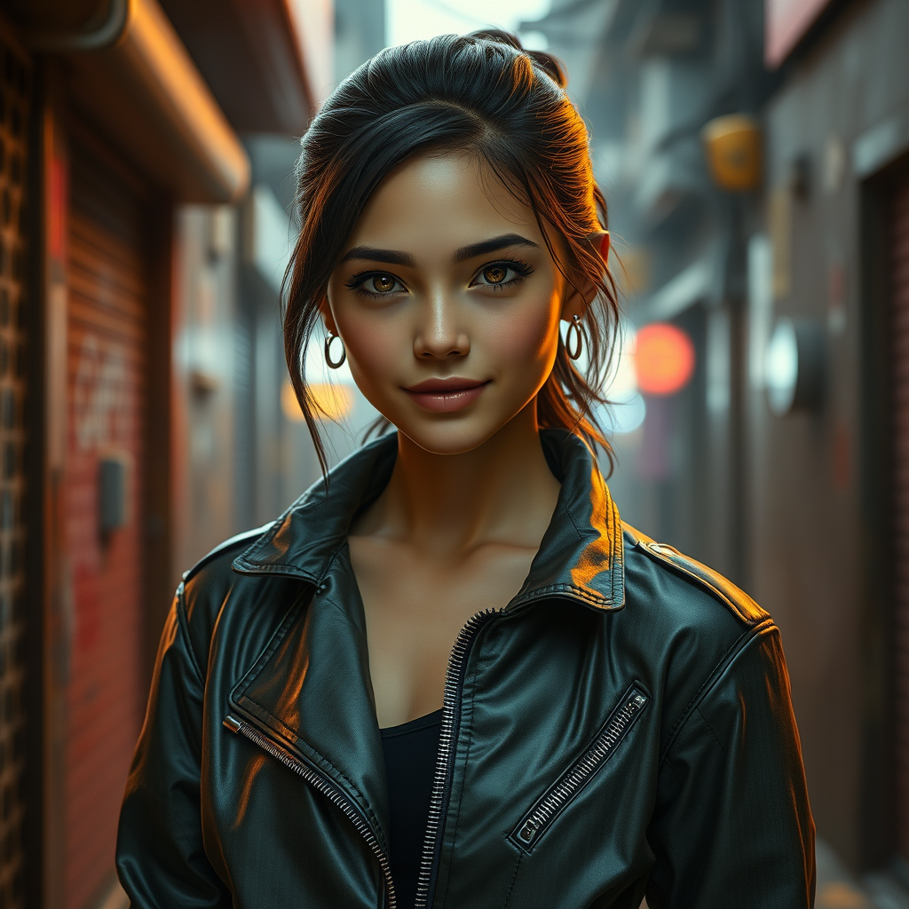 A stunning young cyborg girl with a mysterious smile and bright, piercing eyes, embodying the Deus Ex Mankind Divided aesthetic. She stands in a slum alley, illuminated by pastel lighting, sporting a fashionable blown jacket akin to a magazine spread. Her hair is naturally glossy and perfectly styled. Shot with a 150mm lens and ISO 100, the scene captures the contrast of her high-tech allure against the gritty urban backdrop. Despite the cityscape's rough edges, her presence exudes sophistication, with an emphasis on sleek design and futuristic elegance.