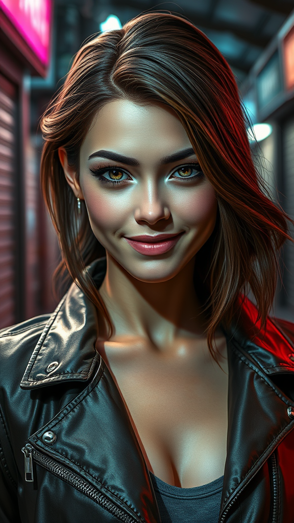 A stunning young cyborg woman, inspired by Deus Ex Mankind Divided, with pastel lighting casting a soft glow on her mysterious smile. Her bright and piercing eyes captivate the viewer, and she wears a stylish blown jacket reminiscent of a fashion magazine spread. Set in a slum alley at night in the city, the scene is vibrant with natural glossy hair framing her face. The image is captured with a 150mm lens and ISO 100, ensuring clarity and detail. Despite the gritty backdrop, her attire and overall appearance convey a sense of elegance and sophistication. The composition avoids imperfections such as poorly drawn clothes, broken fabric lines, or anatomical errors, ensuring a seamless visual experience.