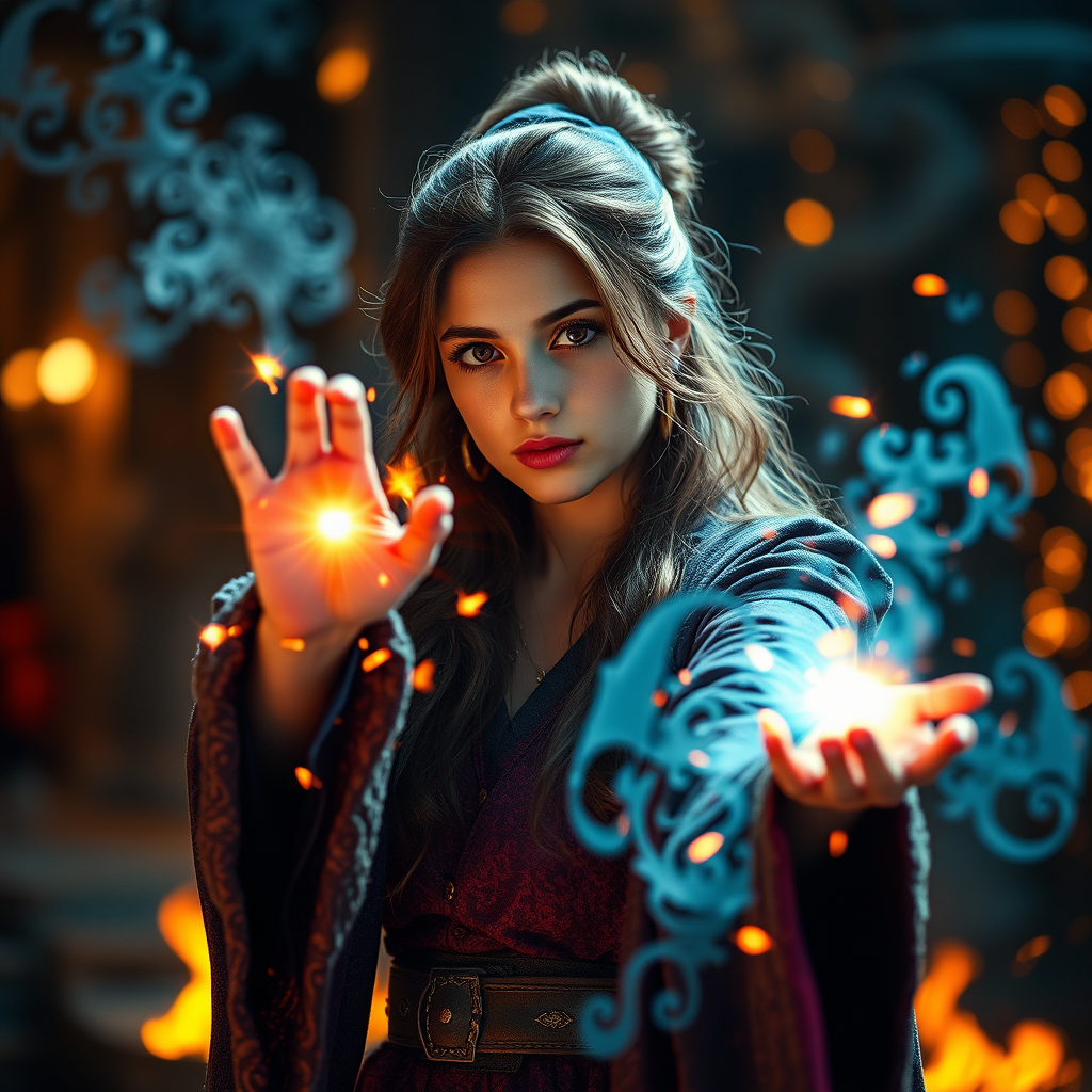 A stunning young female wizard casting enchanting spells is set at the focal point of a mesmerizing scene, surrounded by glowing embers and a backdrop of dreamy bokeh. There's a striking lens flare and light bloom that adds to the cinematic atmosphere, enhanced by the rich depth of field and HDR quality. This ultra high-detail, high saturation image evokes a sense of magic and mystique. Despite the vibrant display, there is an intriguing enigma, as her arms and hands appear subtly obscured, adding mystery to her powerful presence.