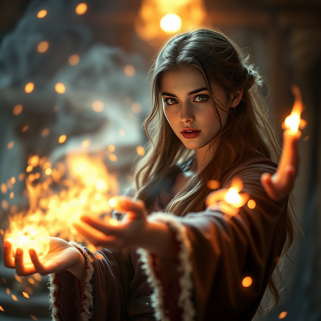 A stunning young female wizard conjures powerful spells, surrounded by flickering embers and a mesmerizing bokeh effect. The scene is bathed in cinematic lighting with lens flare and light bloom, creating an enchanting atmosphere. The depth of field adds a sense of immersion, while HDR enhances the ultra high-detail and vivid high saturation. Despite the ethereal beauty, there's an air of mystery with missing arms and hands, leaving her magic to speak for itself, as if transcending the physical realm, complemented by a mysterious watermark that hints at her otherworldly nature.